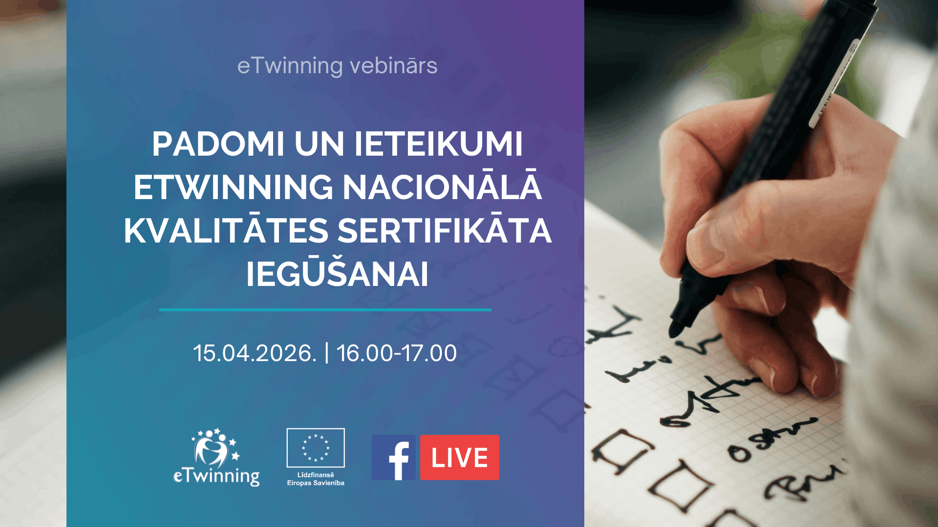 eTwinning Nacionālais atbalsta dienests aicina skolotājus, eTwinning projektu īstenotājus un citus interesentus šī gada 15. aprīlī plkst. 16.00 piedalīties bezmaksas tiešsaistes seminārā “Padomi un ieteikumi eTwinning Nacionālā kvalitātes sertifikāta iegūšanai”. Tiešsaistes seminārā pedagoģijas eksperte Liene Millere skaidros, kā sagatavot kvalitatīvu eTwinning Nacionālā kvalitātes sertifikāta pieteikumu un izvairīties no biežāk pieļautajām kļūdām.