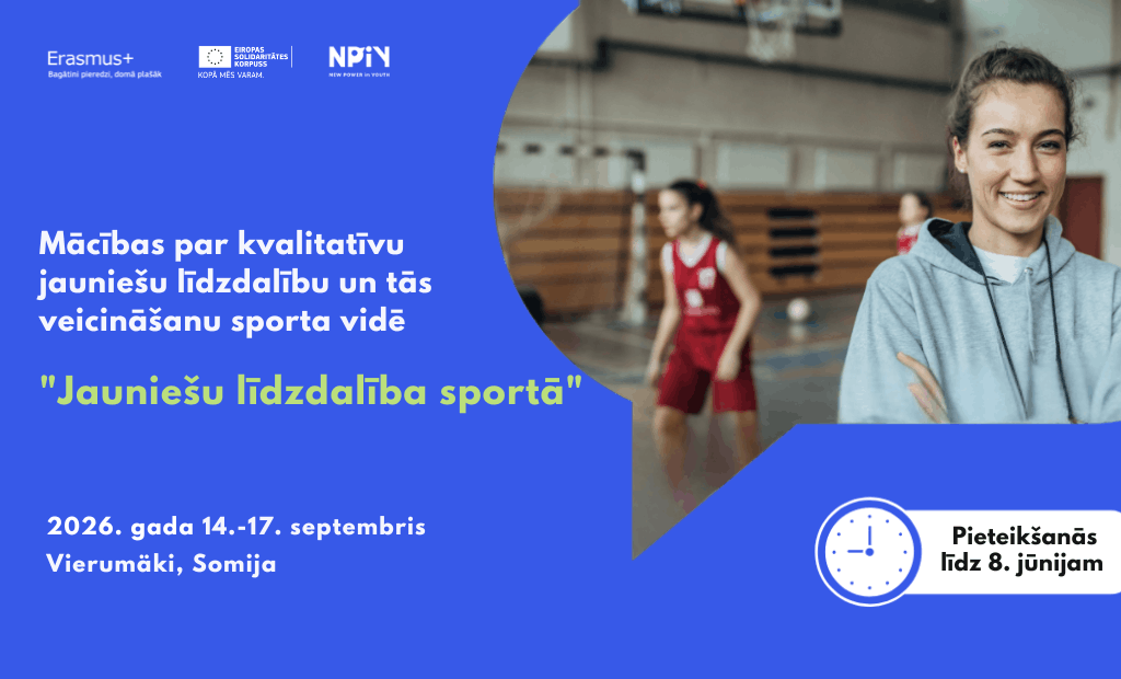 Jaunatnes starptautisko programmu aģentūra (JSPA) aicina līdz 8. jūnijam pieteikties mācībām par kvalitatīvu jauniešu līdzdalību un tās veicināšanu sporta vidē “Jauniešu līdzdalība sportā”. Tās notiks no 2026. gada 14. līdz 17. septembrim Vierumäki, Somijā. Pieteikties aicināti sporta organizāciju un klubu pārstāvji (treneri, instruktori, vadītāji), kuri strādā ar jauniešiem un vēlas viņus vairāk iesaistīt kluba dzīvē un attīstībā.