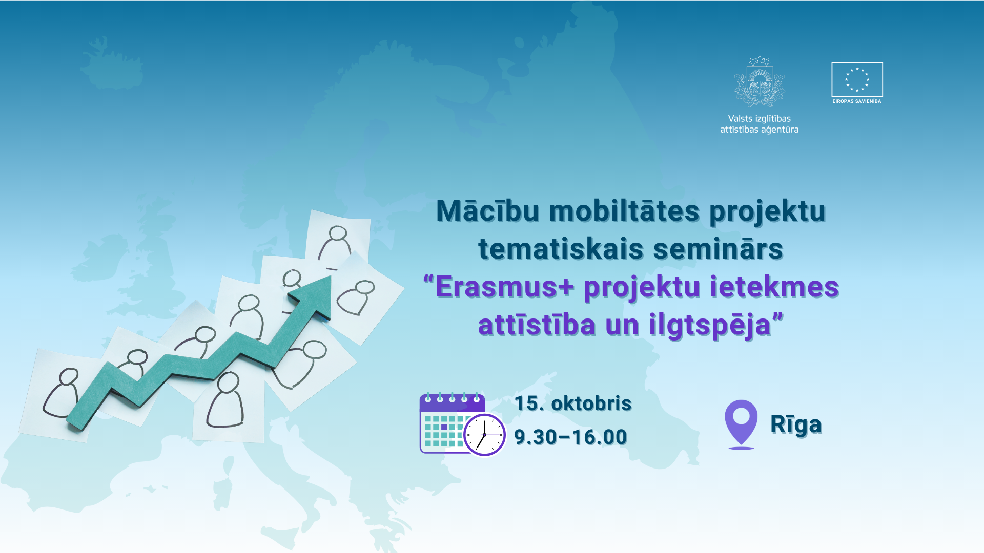 Aicinām Erasmus+ Mācību mobilitātes (KA1) projektu īstenotājus skolu, profesionālās, pieaugušo izglītības un sporta jomā piedalīties tematiskajā monitoringa seminārā “Erasmus+ projektu ietekmes attīstība un ilgtspēja”, kas notiks 15. oktobrī no plkst. 9.30 līdz 16.00 Rīgā. Darba valoda – latviešu un angļu.