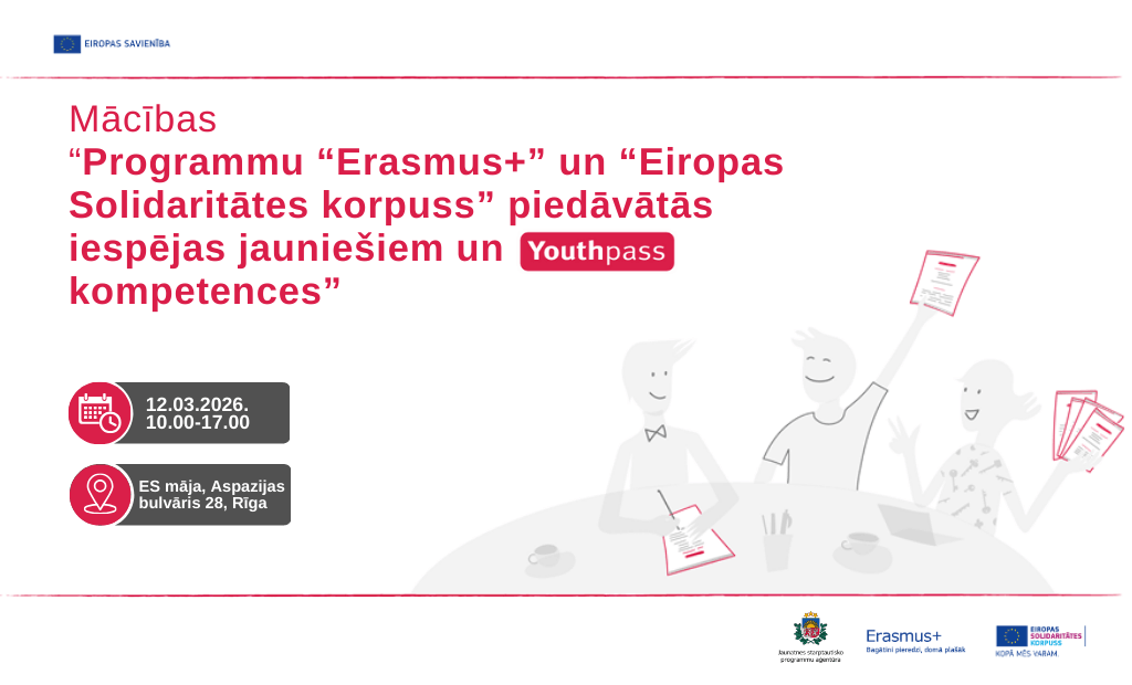 Jaunatnes starptautisko programmu aģentūra (JSPA) līdz 16. februārim (ieskaitot) aicina pieteikties mācībām par Eiropas Savienības jaunatnes programmu “Erasmus+” un “Eiropas Solidaritātes korpuss” piedāvātajām iespējām jauniešiem, 8 mūžizglītības kompetencēm un to nozīmi darbā ar skolēniem. Tās notiks 2026. gada 12. martā plkst. 10.00-17.00 klātienē “ES Mājā” (Aspazijas bulvārī 28, Rīga).