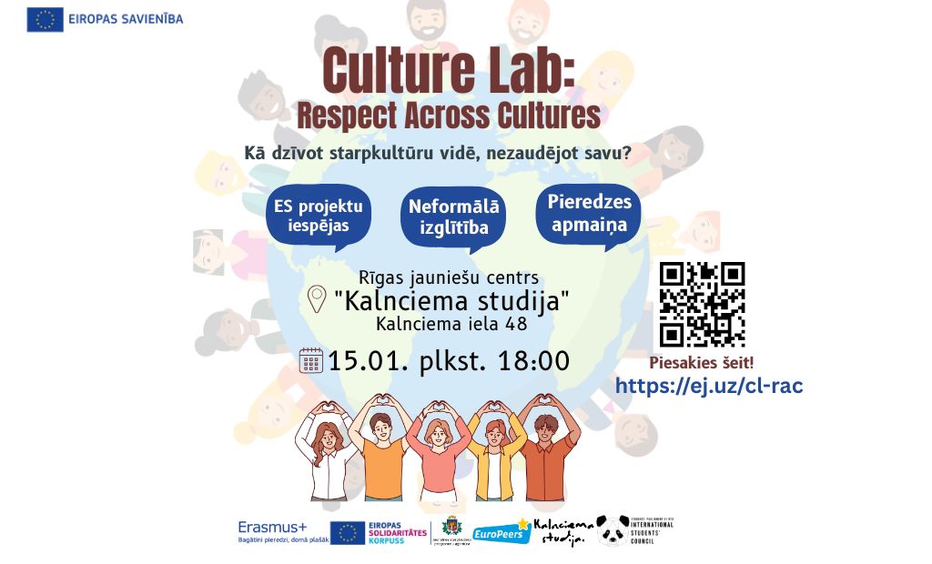 Jaunatnes starptautisko programmu aģentūras (JSPA) koordinētā vēstnešu tīkla “EuroPeers” jaunieši aicina pieteikties pasākumam “Culture Lab: Respect Across Cultures”, kura laikā jauniešiem būs iespēja rast atbildi uz šo sarežģīto jautājumu: “Kā dzīvot starpkultūru vidē, nezaudējot savu?”