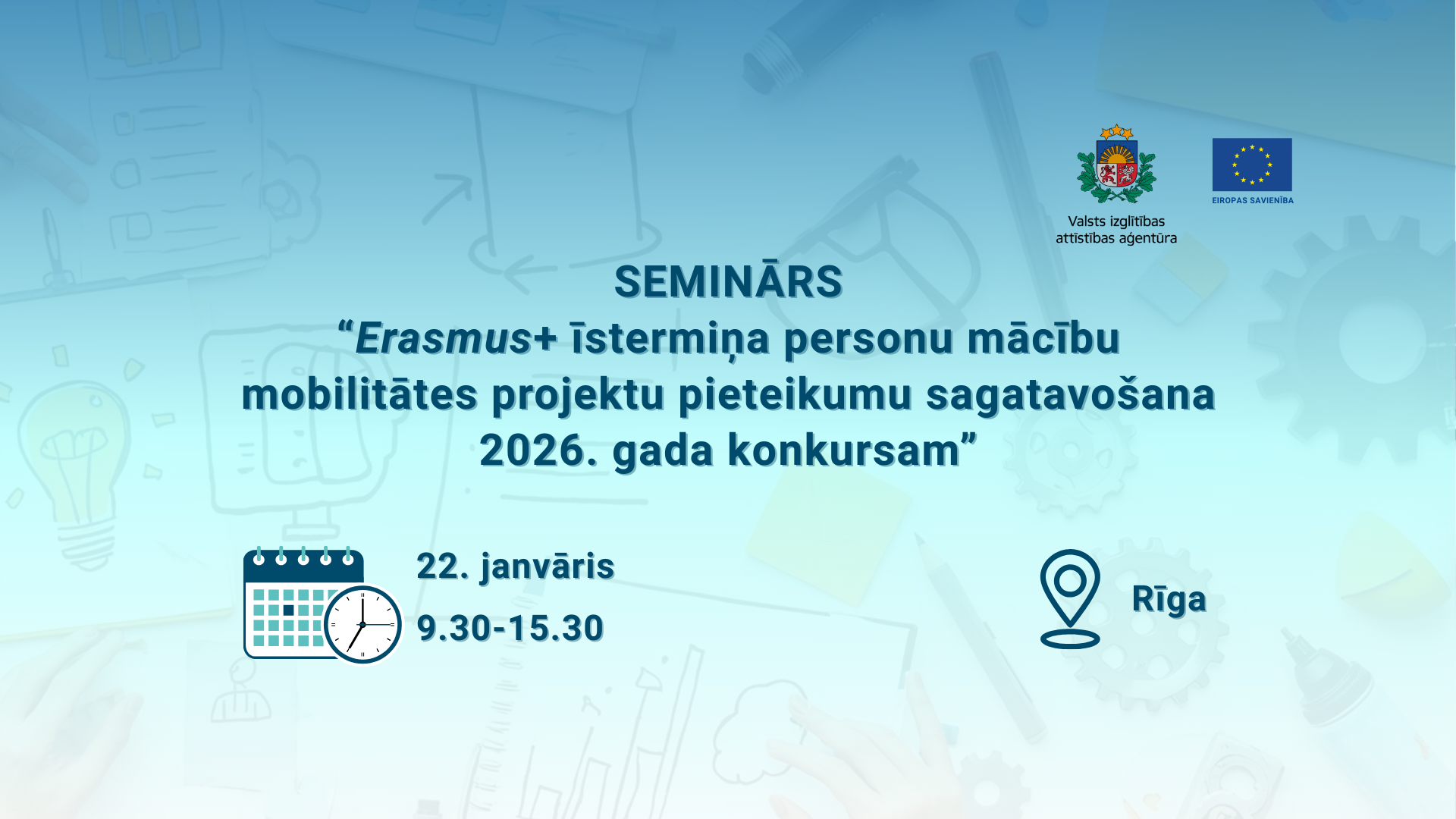 Valsts izglītības attīstības aģentūra 2026. gada 22. janvārī no plkst. 9.30 līdz 15.30 Rīgā organizē klātienes semināru par Erasmus+ īstermiņa personu mācību mobilitātes projektu pieteikumu (KA122) sagatavošanu. Seminārs paredzēts organizācijām, kas plāno iesniegt īstermiņa projekta pieteikumu 2026. gada konkursa ietvaros skolu izglītības (SCH), profesionālās izglītības un apmācības (VET) un pieaugušo izglītības (ADU) izglītības sektorā.