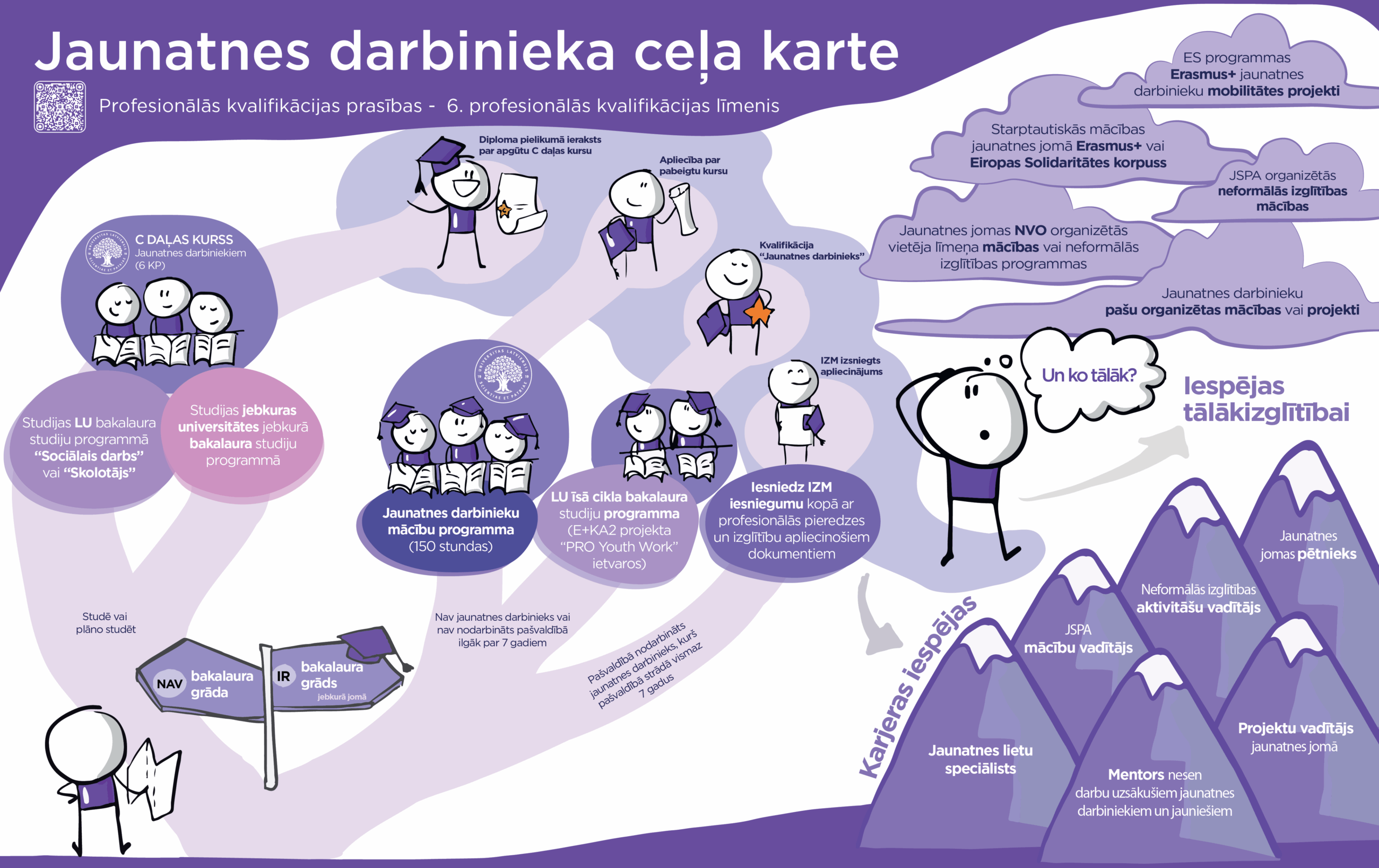Tāpat pasākumā tika prezentēta izstrādātā jaunatnes darbinieka ceļa karte – vizuāls pārskats par iespējamiem izglītības un profesionālās attīstības soļiem jaunatnes jomas speciālistiem Latvijā: sākot ar brīvās izvēles daļas kursu LU bakalaura programmās “Skolotājs” un “Sociālais darbs” (tiem, kuriem nav bakalaura grāda) un pilno 150 stundu Pamatkompetenču programmu (tiem, kuriem jau ir bakalaura grāds), līdz tālākizglītības iespējām, neformālās izglītības mācībām, ES jaunatnes programmu mobilitātes projektiem un karjeras virzieniem jaunatnes jomā. Tā ir cieši saistīta ar jaunajām profesionalizācijas prasībām — jaunatnes darbiniekam ir noteikts 6. profesionālās kvalifikācijas līmenis. 2024. gadā apstiprinātais jaunatnes darbinieka profesijas standarts ir būtisks instruments profesijas atpazīstamības un prestiža celšanai, kā arī palīdz risināt tādus nozares izaicinājumus kā nepilnīga izglītības sistēma, emocionālais slogs un neskaidras atbildības robežas.