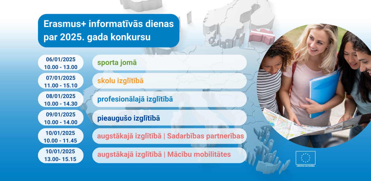 Valsts izglītības attīstības aģentūra (VIAA) no 2025. gada 6. līdz 10. janvārim organizē tiešsaistes informatīvās dienas par Eiropas Savienības Erasmus+ programmas 2025. gada projektu pieteikumu konkursu izglītības, mācību un sporta jomā.