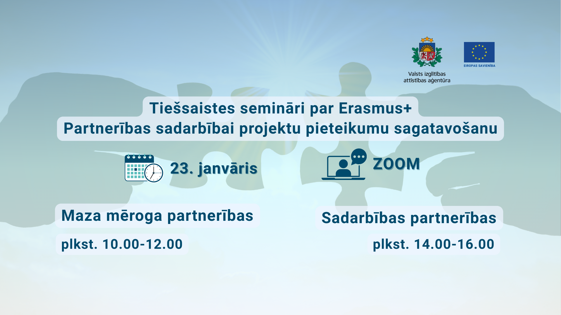 Valsts izglītības attīstības aģentūra (VIAA) 2026. gada 23. janvārī organizē tiešsaistes seminārus par Maza mēroga partnerību un Sadarbības partnerību projektu pieteikumu sagatavošanu un iesniegšanu Eiropas Savienības Erasmus+ programmas 2026. gada konkursā.