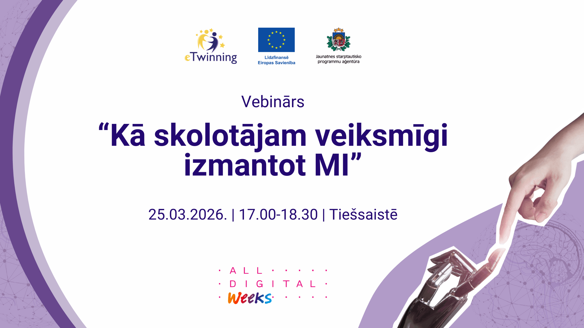 Jaunatnes starptautisko programmu aģentūras ietvaros eTwinning Nacionālais atbalsta dienests aicina skolotājus, izglītības iestāžu vadību un citus interesentus šī gada 25. martā plkst. 17.00 piedalīties bezmaksas vebinārā “Kā skolotājam veiksmīgi izmantot MI”. Vebināra dalībnieki iepazīsies gan ar teoriju, gan saņems praktiskus un noderīgus padomus par mākslīgā intelekta (MI) izmantošanu ikdienas darbā. Vebinārs norisināsies “Digitālās nedēļas 2026” ietvaros.
